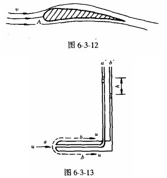 當流體受到迎面物體的阻礙,被迫向兩邊(或四周)分流時,在物體表面上受流體頂沖的A點(如機翼),流體的速度等于零,此點稱滯止點(駐點)如圖(6—3—12)所示。在滯止點處流體的動能全部轉(zhuǎn)化為壓能。畢托管就是利用這一原理制成的,這是廣泛用于測量液流和氣流的點速度u的一種儀器,如圖(6—3—13)所示,它的管的前端開孔a,正面迎著液流或氣流。a端內(nèi)部有通路與上部b'端相通。管側(cè)有四個孔口b,它的內(nèi)部也有通路與上部b'端相通。當測定流體中某點流速時,a'、b'兩管分別同U形壓差計接通后,就可測出a、b兩處的壓差。a點為滯止點,在a處由于流體受阻、流速為零,其壓強p=,而流體在b處,流速恢復原有流速u,壓強pb比Pa小,沿ab流線寫出元流能量方程后得出流速: