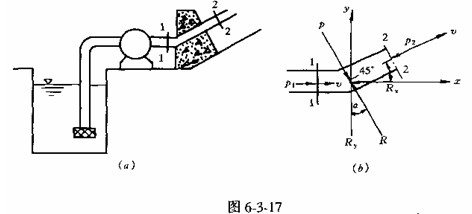 [解] 如圖6—3—17(b)所示,取彎管前后斷面1—1和2-2流體為分離體,現分析分離體上外力和動量變化。