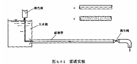 雷諾曾經(jīng)以圖6-4—1的裝置來進(jìn)行實(shí)驗(yàn),揭示了兩種流態(tài)不同的本質(zhì)并確定圓管流態(tài)的判別數(shù)。