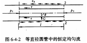 取一段等直徑圓管中的恒定均勻流來討論,見圖6-4-2。均勻流動中的能量損失只有沿程不變的切應力產生的沿程損失,用hf表示。