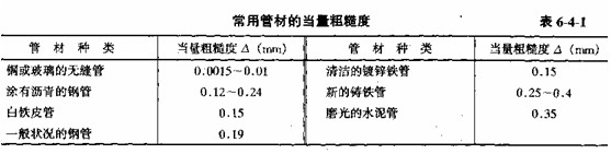 使用莫迪曲線求沿程阻力系數十分簡便,查圖的精度基本上能滿足工程上的需要。圖 中的Δ并非簡單的粗糙凸起高度,而是工業管道的當量粗糙度,常用管材的當量粗糙度見表6-4-1。