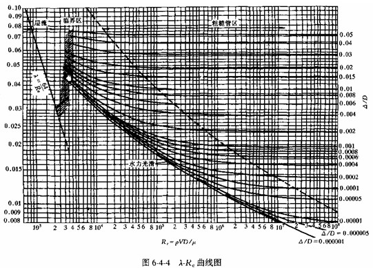 是根據大量工業管道的試驗資料提出的。為了簡化計算,莫迪在此公式基礎上繪成曲線(圖6-4-4)稱莫迪圖。從莫迪圖中可以看到:其中橫坐標和縱坐標都是按對數分格的,稱為雙對數格紙,這樣畫出來的λ-R,曲線圖形即為lgλ一lgRe的曲線圖形。