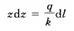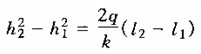 圖6-7-2所示,不透水層頂部(或含水層底板)水平。地下水面(包括無壓水的自由表面及有壓水的測壓管水頭面)在集水廊道未排水或抽水前的水面稱地下水靜水面,排入后到達恒定狀態的水面稱動水面,動水面的水面線也叫浸潤曲線。還假定集水廊道開挖到不透水層,于是集水廊道底面不進水。集水廊道垂直于底面方向單位寬度(B=1)的單寬流量q=vz=kJz,根據裘布依,J=sinθ≈tgθ=dz/dl,q=kztgθ=kz·dz/dl,令距離廊道l1和l2的地下水深分別為h1和h2,將上式分離變量,