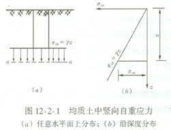 建筑物建造之前,土中的應力是由土體本身自重引起的。假定天然地面是一個無限大的水平面,因而任意豎直面和水平面上均無剪應力存在。如果地面下土質均勻,天然重度為γ,則地面下任意深度z處α-α水平面上的豎向自重應力σcz等于該水平面以上土柱的重量,即