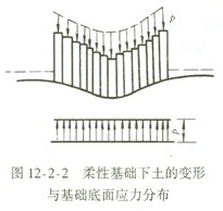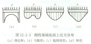 建筑物荷載通過基礎(chǔ)傳給地基的壓力,稱為基底壓力,地基反作用于基礎(chǔ)底面的反力稱為接觸應(yīng)力。根據(jù)彈性理論分析,基底接觸應(yīng)力分布規(guī)律取決于基礎(chǔ)的剛度和地基的變形條件兩者共同工作的結(jié)果。如果基礎(chǔ)是柔性的,能跟隨地基土表面變形而變形,則基底反力分布規(guī)律與上部荷載分部形式一致,見圖12-2-2所示。上部荷載是均布,基底反力也是均布但基礎(chǔ)變形是不均勻的與地基變形一致中間大,兩邊小。當(dāng)基礎(chǔ)剛度為絕對剛性時(shí),由于基礎(chǔ)本身不能變形,基礎(chǔ)底面保持一平面。因此它將迫使地基的沉降各點(diǎn)一致為一常數(shù),所以基底接觸應(yīng)力分布與上部荷載分布不同;與地基土的性質(zhì)、基礎(chǔ)的形狀、埋置深度等因素有關(guān)。見圖12-2-3所示。圖12-2-3(a)是根據(jù)彈性理論分析得到的反力分布形式,基礎(chǔ)邊緣的應(yīng)力為無窮大,這一部位土產(chǎn)生塑性變形,因此接觸應(yīng)力只能呈圖12-2-3(b)馬鞍型;當(dāng)荷載增大時(shí),邊緣塑性區(qū)發(fā)展,應(yīng)力調(diào)整,中間部位應(yīng)力增加而成圖12-2-3(c)拋物線形;當(dāng)?shù)鼗咏茐臅r(shí),基底接觸應(yīng)力呈圖12-2-3(d)的鐘形。