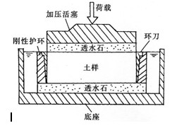 試驗時,用環刀切取厚度為2cm的圓柱形試樣,連同環刀置于剛性護環中。試樣上下放透水石,以便土樣受壓后土中孔隙水排出。由于金屬環刀的限制,土樣只能發生豎向壓縮而變形。如果土樣是在地下水位以下取出的,在試驗時要在護環內注水,保持土樣浸在水里,防止水分蒸發。