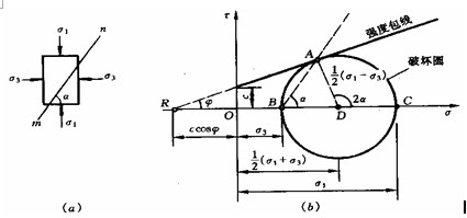 (α)單元微體; (b)極限平衡狀態時的莫爾圓