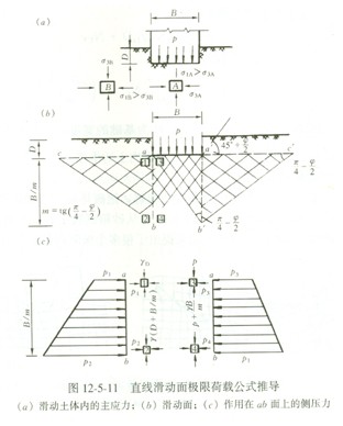 。見圖12-5-11 (b)所示。基礎底面以下土體發生主動破壞,稱為主動區;基底外土體發生被動破壞,稱為被動區。滑動面由兩個平面所組成。建立主動區與被動區界面ab面的平衡條件,見圖12-5-11 (c)所示。