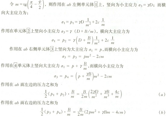 埋置深度為D,寬度為B的條形基礎,見圖12-5-11 (α)。假定基礎底面無摩擦,可以設想基底下作用在A土體單元上的豎向為大主應力σlA,而橫向為小主應力σ3A。作用在基底范圍以外B單元上橫向是大主應力σ1B;而豎向是小主應力σ3B。因此當荷載p增加,地基發生整體破壞時地基中形成二組滑動面在基礎范圍內aa‘為大主應力平面,因此滑面方向與aa‘面夾角為