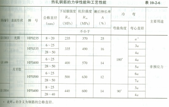 根據(jù)《鋼筋混凝土用熱軋光圓鋼筋》GB 13013-1991、《鋼筋混凝土用熱機(jī)帶肋筋》 GB 1499-1998、《鋼筋混凝土用余熱處理鋼筋》GB 13014-1991的規(guī)定,熱軋鋼筋按機(jī)械性能劃分成四個(gè)等級(jí)。各個(gè)等級(jí)的鋼筋應(yīng)符合表10-2-6中所要求的機(jī)械性能。