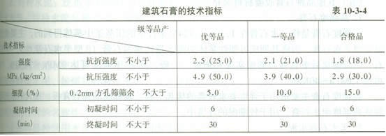 根據GB 9776-88規定,建筑石膏按強度、細度、凝結時間指標分為優等品、一等 品和合格品三個等級,見表10-3-4。其中,抗折強度和抗壓強度為試樣與水接觸后兩小時 得的。
