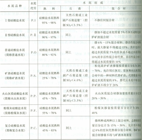在我國常用水泥主要品種有:硅酸鹽水泥、普通硅酸鹽水泥、礦渣硅酸鹽水泥、火山灰質硅酸鹽水泥、粉煤灰硅酸鹽水泥、復合硅酸鹽水泥等。一般的命名原則是:凡以硅酸鹽水泥熟料摻加一定數量以上的混合材和適量石膏磨制成的水泥,則在硅酸鹽水泥之前冠以所以用混合材的名稱作為水泥品種的名稱。