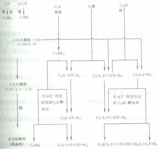 硅酸鹽水泥的水化過程概括如圖10-4-1所示,水泥加水后,首先石膏迅速溶解于水,C3A立即發(fā)生反應(yīng), C4AF與C3S亦很快水化而自β-C2S則稍慢。幾分鐘后在電子顯微鏡下可以觀察到水泥顆粒表面生成針狀晶體、立方片狀晶體和無定型的水化硅酸鈣凝膠(C-S-H)。尺寸相對(duì)較大的立方板狀晶體是氫氧化鈣,針狀晶體(或立方棱柱狀晶體)是三硫型水化硫鋁酸鈣晶體(鈣釩石AFt)。以后由于不斷地生成三硫型水化硫鋁酸鈣,使液相中SO4-離子逐漸耗盡后, C3A與C4AF和三硫型水化硫鋁酸鈣作用生成單硫型水化硫酸酸鈣(AFm)。生成的3CaO· (Al2O3. Fe2O3,) . CaSO4 . 12HzO可再和4CaO· (Al2O4 . Fe3O4)13HzO形成固溶體,如果石膏不足,還有C3A或C4AF剩留,則會(huì)生成單硫型水化硫鋁酸鈣和C4(AF)H13的固溶體,甚至單獨(dú)的C4(AF)H13,而后逐漸變成穩(wěn)定的等軸晶體C3(AF)H6。