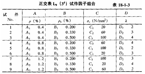 采用正交試驗設(shè)計法的正交表L9(34)并按表18—1—3組合時,當因子數(shù)為4和每個因子有3個水平數(shù)時,組成的試件數(shù)為9。即原來要求的81個試件可以綜合為9個試件、由此可見,正交試驗設(shè)計可以只需要少量的試件就可得到主要的信息,對研究問題作出綜合評價。不足之處是不能提供某一因子的單值變化與試驗?zāi)繕酥g的函數(shù)關(guān)系。