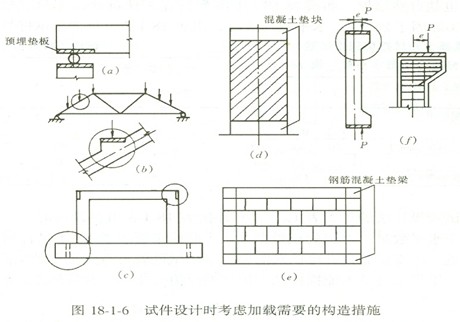 在試件設計中還必須同時考慮試件安裝、加載、量測的需要,在試件上作出必要的構造措施,這對于科研試驗尤為重要。例如混凝土試件的支承點應頂埋鋼墊板(圖18—1—6(a));在屋架試驗受集中荷載作用的位置上應埋設鋼板,以防止試件受局部承壓而破壞;試件加載面傾斜時,應作出凸緣(圖18—1—6(b)),以保證加載設備的穩定設置;在鋼筋混凝土框架試驗時,為了框架端部側面施加反復荷載的需要,應設置預埋構件以便與加載用的液壓加載器或測力傳感器連接,為保證框架柱腳部分與試驗臺的固接,一般均設置加大截面的基礎梁(圖18—1—6(c));在磚石或砌塊的砌體試驗中,為了使施加在試件的垂直荷載能均勻傳遞,一般在砌體試件的上下均應預先澆搗混凝土的墊塊(圖l8—1-6((d)),對于墻體試件在墻體上下均應搗制鋼筋混凝土墊梁,其中下面的墊梁可以模擬基礎粱,使之與試驗臺座固定,上面的墊梁模擬過梁傳遞豎向荷載(圖18—1—6(e));在作鋼筋混凝土偏心受壓構件試驗時,在試件兩端作成牛腿以增大端部承壓面和便于施加偏心荷載(圖18—1—6(f)),并在上下端加設分布鋼筋網進行加強。