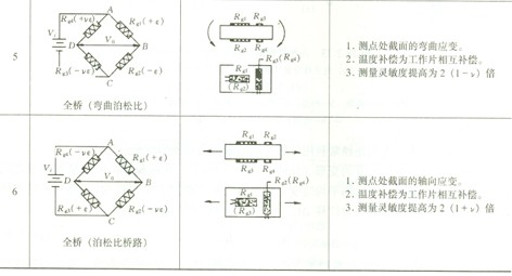由上式可知,當△R≤R時,輸出電壓與應變成線性關系,與四個橋臂應變的代數和成線性關系;相鄰橋臂的應變符號相反,如ε1與ε2,相對橋臂的應變符號相同,如ε1與ε3。由此可得電橋的橋臂特性,即當相鄰橋臂的應變增量同號時,其作用相互抵消;異號時,其作用相互疊加。而兩相對橋臂的應變增量同號時,其作用相互疊加;異號時,其作用則相減輸出,兩者情況正好相反。利用這一特性,可以進行溫度補償和求得不同聯接時的橋臂系數及相應不同的量測靈敏度。見表18—2—1。