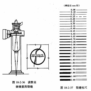 測量裂縫寬度通常用讀數顯微鏡(圖18—2—36),它是由光學透鏡與游標刻度等組成。還可以用印有不同寬度線條的裂縫標尺(圖18—2—37)與裂縫對比來確定裂縫寬度;也可使用一組具有不同厚度的標準塞尺進行試插,正好插入裂縫的塞尺厚度即為該裂縫的寬度。
