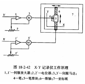 圖18—2—42為X—Y記錄儀的工作原理,X、Y軸各由一套獨(dú)立的,以伺服放大器、電位器和伺服馬達(dá)組成的系統(tǒng)驅(qū)動(dòng)滑軸和筆滑塊;用多筆記錄時(shí),將y軸系統(tǒng)作相應(yīng)增加,則可同時(shí)得到若干條試驗(yàn)曲線。試驗(yàn)時(shí),將試驗(yàn)變量1(如某一個(gè)位移傳感器)接通到X軸方向,將試驗(yàn)變量2(如荷載傳感器)接通到y(tǒng)軸方向;試驗(yàn)變量1的信號(hào)使滑軸沿X軸方向移動(dòng)、試驗(yàn)變量2的信號(hào)使筆滑塊沿y軸方向移動(dòng),移動(dòng)的大小和方向與信號(hào)一致,由此帶動(dòng)記錄筆在坐標(biāo)紙上畫(huà)出試驗(yàn)變量1與試驗(yàn)變量2的關(guān)系曲線。如果在X軸方向輸入時(shí)間信號(hào),或使滑軸、或使座標(biāo)紙沿X軸按規(guī)律勻速運(yùn)動(dòng),就可以得到某一試驗(yàn)變量與時(shí)間的關(guān)系曲線。