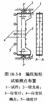 圖18—3—8所示為偏心受壓短柱試驗(yàn)時(shí)的測(cè)點(diǎn)布置。試件的側(cè)向位移是由布置在受拉區(qū)邊緣的百分表或撓度計(jì)進(jìn)行量測(cè),除了量測(cè)中點(diǎn)最大的側(cè)移值外,可用側(cè)向五點(diǎn)布置法量測(cè)側(cè)移曲線。對(duì)于正位試驗(yàn)的長(zhǎng)柱它的側(cè)向位移可用經(jīng)緯儀觀測(cè)。