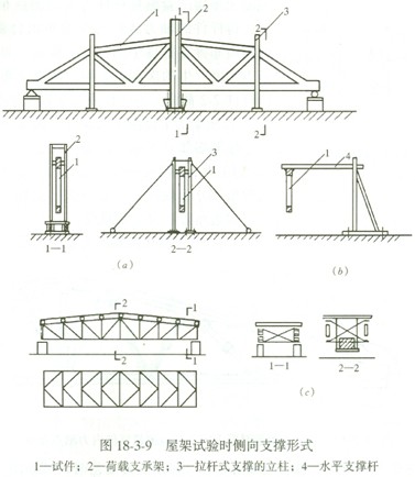 屋架進行非破壞性試驗時,在現場也可以采用兩榀屋架同時試驗的方案,這時出平面穩定問題可用圖18—3—9(c)的K形水平支撐體系來解決。也可以用大型屋面板做水平支撐。
