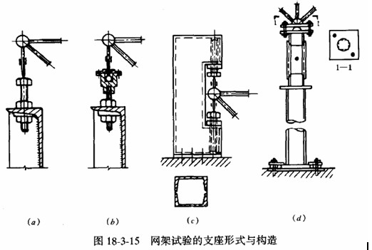 網架結構在試驗中一般按實際結構支承點的個數將網架模型支承在剛性較大的型鋼圈梁上。一般支座均為受壓,采用螺栓做成高低可調節的支座,如圖18—3—15(a)所示。由于網架平面體型的不同,在邊界角點及其鄰近的支座經常可能出現受拉現象,在工程試驗中采用了鋼球鉸點支承形式如圖18—3—15(b),圖18—3—15(c)所示鎖形拉壓兩用支座,它可以適應于受壓或受拉的受力狀態。對于四立柱支承的方形雙向正交網架模型試驗中,采用了球面板做成的鉸接支座(圖18—3—15d)。
