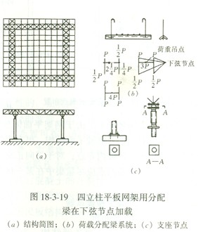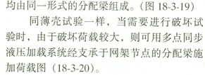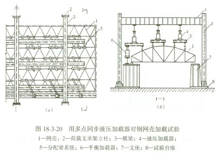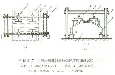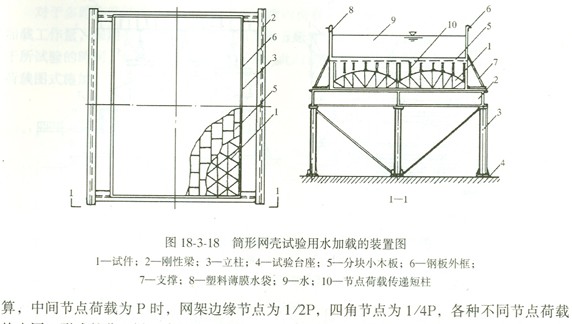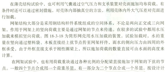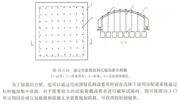 殼體結構一般情況下可以用重力直接加載,將荷載分垛鋪設于殼體表面;也可以通過殼面預留的洞孔直接懸吊荷載(圖18—3—16)并可在殼面上用分配梁系統施加多點集中荷載。