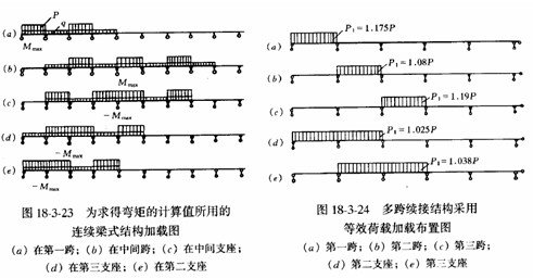 對于多跨連續結構,一般只需考慮五跨內荷載的相互影響,有時為了減少荷載數量和加載工作量,采用等效荷載的方法。如為求五跨連續梁中的最大計算跨間彎矩,可僅加載于所試驗的跨間,而其他跨間則不加荷載。此時活載戶的等效荷載Pl按(圖18—3—24)的荷載圖式施加。