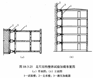 水平荷載可用同步液壓加載系統多點同步加載。在試驗現場要利用臨近有足夠強度剛度的原有建筑為支承樓,替代試驗室內抗側力臺座的反力墻(圖18—3—25)承受施加水平荷載時的反作用力。試驗加載要分為彈性、彈塑性和破壞倒塌等各個階段進行。當試驗加載條件許可時,也可對結構進行在控制變形或控制荷載條件下的低周反復加載試驗。
