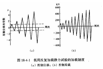 控制作用力的加載方法是通過控制施加于結構或構件的作用力數值的變化來實現低周反復加載的要求。控制作用力的加載制度如圖18—4—1(b)所示。縱坐標用力值表示,橫坐標為加卸荷載的周數。由于它不如控制位移加載那樣直觀地可以按試驗對象的屈服位移的倍數來研究結構的恢復力特性,所以在實踐中這種方法使用得比較少。
