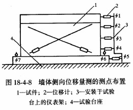 墻體位移主要是測量墻體在低周反復水平荷載作用下的側向位移。可以沿墻體高度在其中心線位置上均勻間隔布置五個測點(圖18—4—8),這樣既可以測到墻體頂部的最大位移,又可以得到墻體的側向位移曲線。測點φ6,φ7可測定墻體轉動。試驗中要注意消除或修正試件的平移和轉動對側向位移的影響。