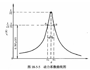 在共振曲線圖的縱坐標上取 值,即0.707μ(θ)處作一水平線,使之與共振曲線相交于A、B兩點,對應于A、B兩點在橫坐標上得ωl,ω2,即可求得衰減系數和阻尼比: