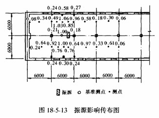在工業廠房中經常要求測量某種振源(如鍛錘、水爆清砂,空氣壓縮機等)引起的振動在建筑物內地面和樓層傳布和衰減的情況。可如圖18—5—13在各測點量測振幅,以振源處實測振幅為1,與之相比求得各點的衰減系數。此外,還可通過在地面和樓層不同測點的振動記錄曲線求得振動在土壤和樓層中傳播的速度。