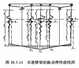 在動力荷載作用下,布置多臺測振傳感器測量結(jié)構(gòu)各點振幅的聯(lián)線,即可得到結(jié)構(gòu)的動態(tài)彈性曲線,也即是結(jié)構(gòu)的振動變位圖。當結(jié)構(gòu)振動是穩(wěn)態(tài)時,可以僅用一臺儀器逐點測量,使用多臺儀器同時測定時,必須注意多臺儀器之間的同步與相位。圖18—5—14雙懸臂梁由五個測點的振動記錄繪制的動態(tài)彈性變形曲線圖可以看出,測點1、5的振幅相位正好與其他各點相差180°。