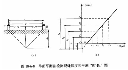 當結構的裂縫部位只有一個可測表面,估計裂縫深度又不大于500mm時,可采用單面平測法。平測時應在裂縫被測部位,以不同測距按跨縫和不跨縫布置測點(布點時應避開鋼筋的影響)進行檢測。如圖18—6—8(a)。