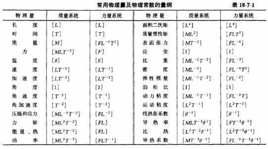 在物理學中,選用質量的量綱[M]、長度的量綱[L]、時間的量綱[T]為基本量綱時,稱為質量系統;在工程學中,則用力的量綱[F]、長度的量綱[L]、時間的量綱[T]為基本量綱,稱為力量系統。這兩個系統對于結構工程中常用物理量和物理常數的量綱表示方法見表18—7—1。