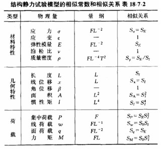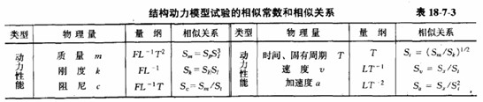 對于結構動力試驗模型,除與表18—7—2靜力模型有關材料特性、幾何特性和荷載等物理量有相同的相似關系外,表18—7—3為有關動力性能物理量的相似關系。