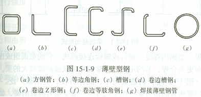 薄壁型鋼的壁厚一般為1.5--5mm,但承重結(jié)構(gòu)受力構(gòu)件的壁厚不宜小于2mm。常用 薄壁型鋼的截面形式圖15-1-9。