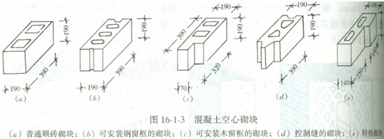 1.混凝土空心砌塊:由普通混凝土制成,有單排孔的和多排孔的,空心率在25%~50%,主規格尺寸為390rnm~190mm~190mm。(圖16-1-3)