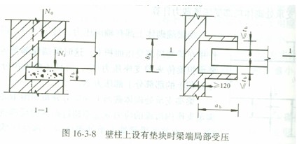 在帶壁柱墻的壁柱內(nèi)設(shè)剛性墊塊時(圖16-3-8),由于翼緣墻多數(shù)位于壓應(yīng)力較小邊,翼墻參加工作程度有限,故計算面積應(yīng)取壁柱范圍內(nèi)的截面面積,不應(yīng)計算翼墻面積。而且這時壁柱上的墊塊伸入翼墻內(nèi)的長度不應(yīng)小于120mm。
