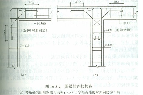 5.圈梁在房屋轉角、丁字接頭處的連接如圖16-5-2a、b