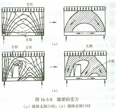 墻梁是由墻和托梁組合而成。當托梁及其上的墻體達到一定強度后。它們兩者就能共同工作,在裂縫出現前,如同鋼筋混凝土和磚砌體兩種材料組成的深梁。根據用有限單元法分析。在均布荷載作用下,其主應力軌跡線如圖16-5-8所示。當墻體無洞口時,主壓應力都指向支座,墻梁形成拱作用,托梁主要受拉,這與一般受彎構件情況不同。根據試驗研究,影響墻梁破壞形態的因素較多,如砌體高跨比(hw/l0)、托梁高跨比(hh/l0)、砌體的抗壓強度設計值(f)、混凝土的軸心抗壓強度設計值(fc)、托梁的縱向受力鋼筋配筋率(ρ)、加荷方式、墻體開洞情況以及有無縱向翼墻等。由于這些因素的不同,將發生下述幾種破壞形態。(圖16-5-9)