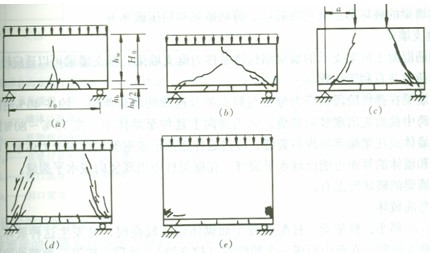 當(dāng)hw/lo <0.35-0.4,砂漿強(qiáng)度等級又較低時(shí),砌體因主拉應(yīng)力超過沿齒縫的抗拉強(qiáng)度,產(chǎn)生沿齒縫截面比較平緩的斜裂縫而破壞,圖16-5-8b。或當(dāng)墻梁頂部作用集中力,且剪跨比a/l0較大時(shí),也易產(chǎn)生斜拉破壞。