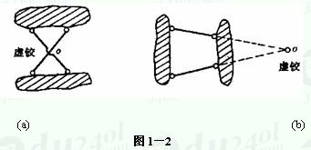 連接兩個剛片的兩根鏈桿的交叉點或其延長線的交點稱為虛鉸(如圖1-2)。兩根鏈桿對兩個剛片運動的約束效果與相應的虛鉸是等效的。
