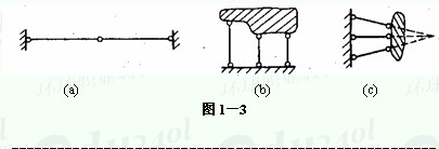 只能作微小運(yùn)動(dòng)的體系稱為瞬變體系。例如圖1-3所示的體系均為瞬變體系。能作非常微小運(yùn)動(dòng)的體系稱為常變體系。如一個(gè)實(shí)鉸連接兩個(gè)剛片的體系及用三根等長且都平行的鏈桿連接兩個(gè)剛片的體系都是常變體系。