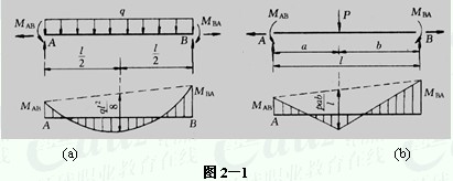 繪制線彈性結(jié)構(gòu)中直桿段的彎矩圖,采用直桿彎矩圖的疊加法。直桿彎矩圖的疊加法 可敘述為:任一直桿,如果已知兩端的彎矩,則桿件的彎矩圖等于在兩端彎矩坐標(biāo)的連線上再疊加將該桿作為簡支梁在荷載作用下的彎矩圖,如圖2-1所示。作彎矩圖時,彎矩值坐標(biāo)繪在桿件受拉一邊,彎矩圖中不要標(biāo)明正、負(fù)號。