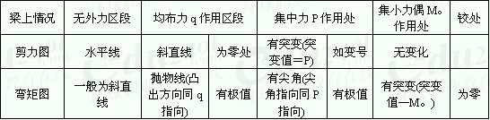 在直桿中,根據荷載集度q,彎矩M、剪力V之間的微分關系dV/dx=q,dM/dx=V、d2M/dx2=q,可推出荷載與內力圖的一些對應關系,這些對應關系構成了彎矩圖與剪力圖的形狀特征(表2—1)。