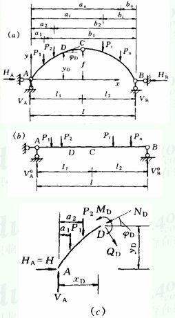 式中VA0、VB0、MC0分別為與三鉸拱相同跨度、相同荷載簡支梁(簡稱為三鉸拱的代 梁,圖2—7b)支座A、B處的支座反力及截面C的彎矩。