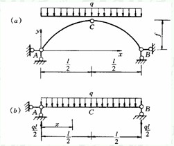 順便指出,三鉸拱在滿跨填料重量作用下的合理拱軸為懸鏈曲線;在徑向均布荷載作用下的合理拱軸為圓弧線。