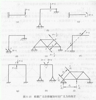 應用單位荷載法計算靜定結構的位移時,虛擬狀態的建立要根據擬求廣義位移的性質 來確定廣義單位力,使虛設廣義單位力在擬求廣義位移上做功,將擬求的廣義位移引入虛 功方程。例如擬求豎向線位移時,可在擬求位移處的豎向施加單位集中力;擬求角位移時,可在擬求位移處施加單位集中力偶;擬求兩點之間的相對水平線位移時,可在此兩點施加一對大小相等方向相反的水平單位集中力;擬求桁架中桿長為d的某桿的轉角時,可在此桿兩端垂直于桿軸方向各施加方向相反、數值為1/d的集中力,等等。