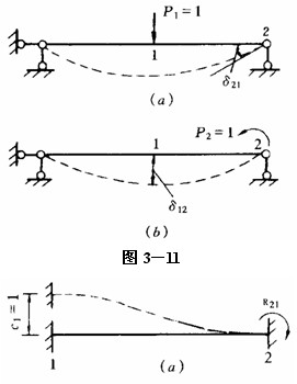 上式表示同一線性彈性體系由單位荷載P1=1所引起的與荷載P2相應的位移δ21 等于由單位荷載P2=1所引起的與荷載P1相應的位移δ12。這里的荷載可以是廣義荷載,因而位移可以是相應的廣義位移。如圖3—11a、b中的δ12=δ21。